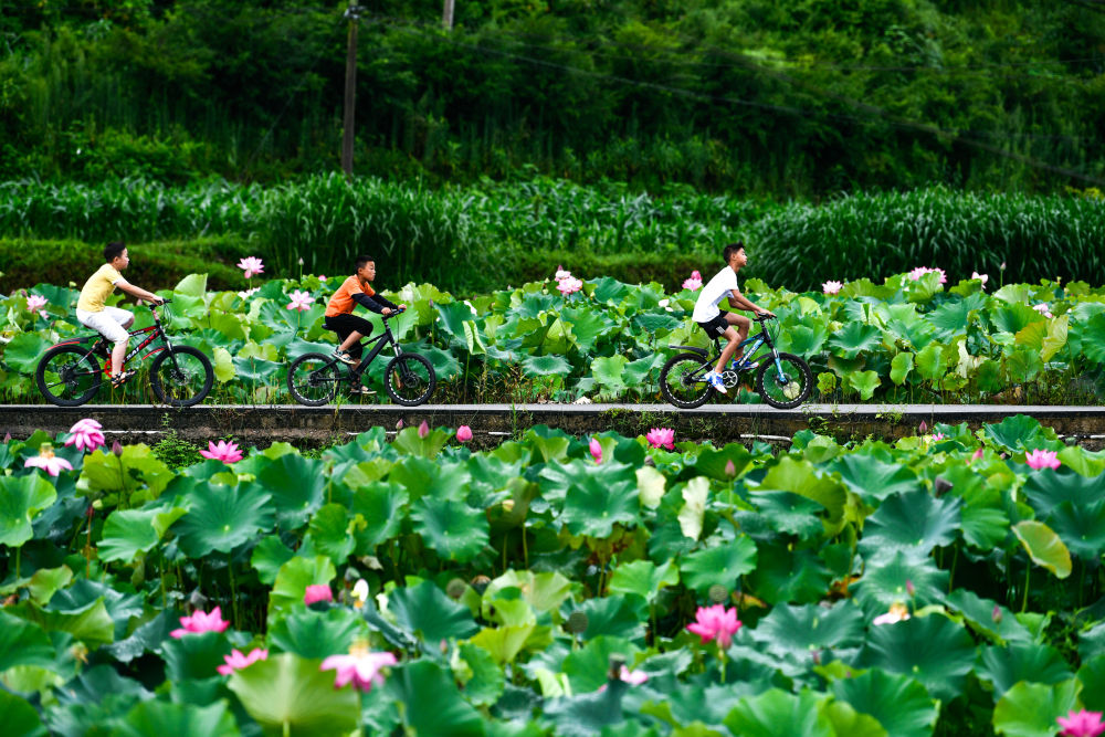 ↑孩子们在贵州省岑巩县客楼镇下寨村骑行游玩(8月2日摄)。