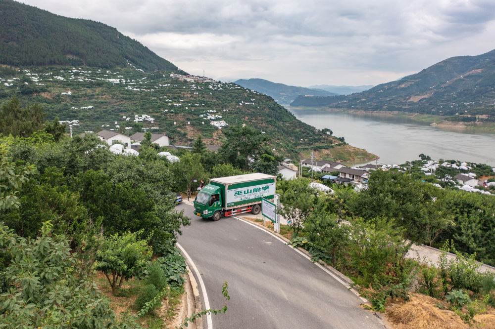 ↑重庆市巫山县曲尺乡柑园村,装载有巫山脆李的中国邮政物流车行驶在村内(无人机照片,6月28日摄)。过去因为物流不便,经过几天的运输后,脆李的品质和口感会受到影响。现在,航空快递的开通,让巫山脆李快速走向全国。