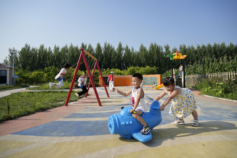 ↑孩子们在河北省唐山市丰南区赵新庄村一处游园内玩耍(7月19日摄)。丰南区因地制宜实施美丽乡村提升工程,通过改造农村闲置破旧房屋、清理沟渠坑塘等措施,300余个行政村建起乡村游园。
