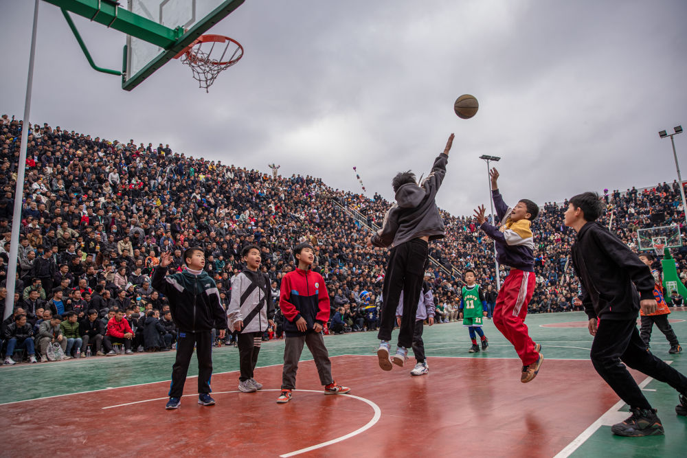 ↑贵州省黔东南州台江县台盘村的小朋友在比赛前打篮球(3月25日摄)。当日,贵州省首届“美丽乡村”篮球联赛总决赛在台盘村开打。