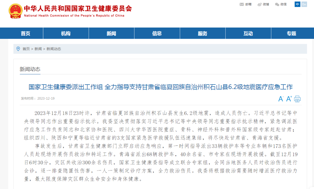 新华社北京12月19日电(记者董瑞丰)记者19日从国家卫生健康委获悉,国家卫生健康委已紧急调派医疗应急工作负责同志和北京协和医院、四川大学华西医院重症、骨科、神经外科和普外科国家级专家赶赴甘肃灾区;组织四川、陕西和宁夏等邻近甘肃省的3支国家紧急医学救援队伍迅速集结,将尽快赴甘肃省、青海省支援。