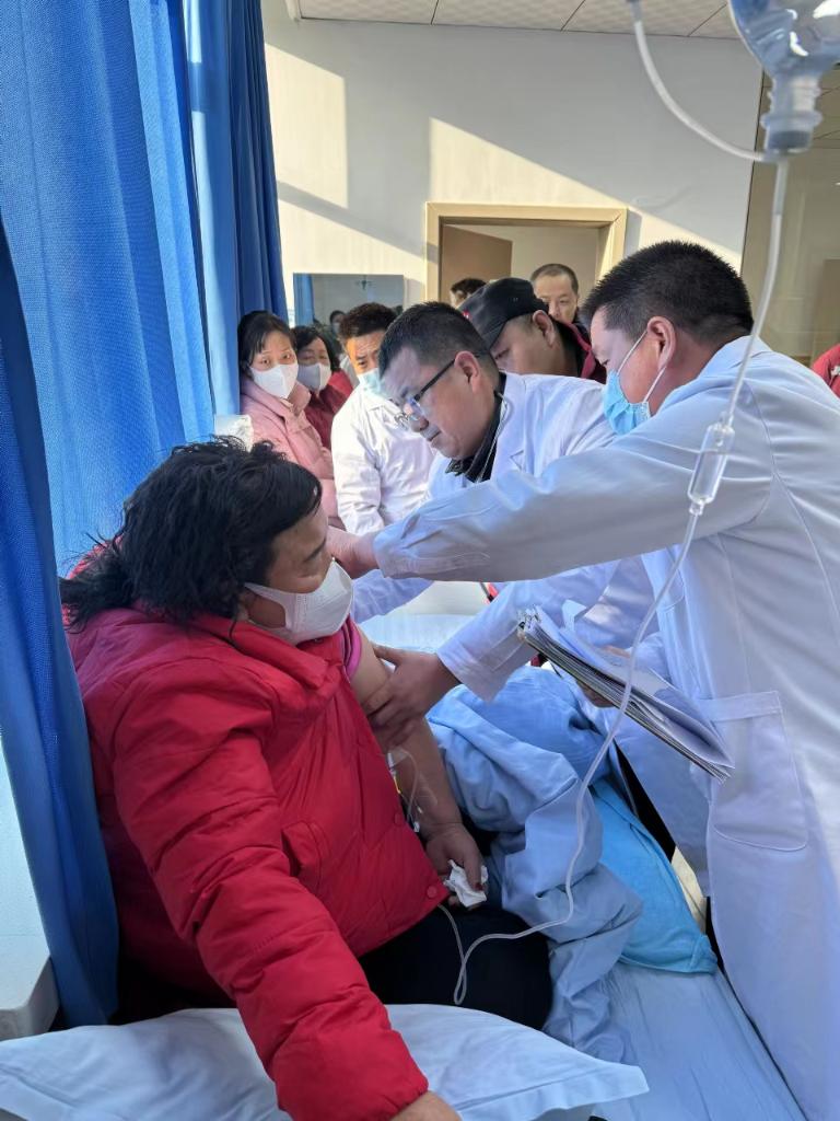 12月19日,兰州大学第二医院普外科医生罗长江(右二)在积石山县人民医院对伤员实施救治。(兰州大学第二医院医疗队供图)