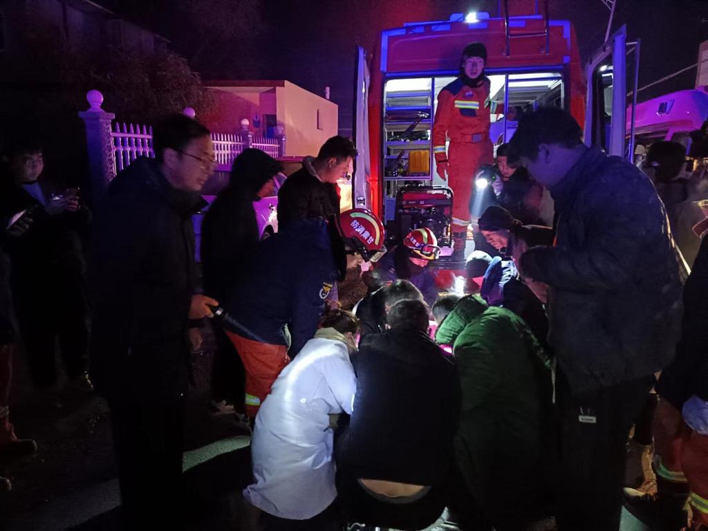 12月19日凌晨3时许,在积石山县大河家镇,临夏县医疗队正在和消防队员一起转运危重伤员。(临夏县医疗队供图)