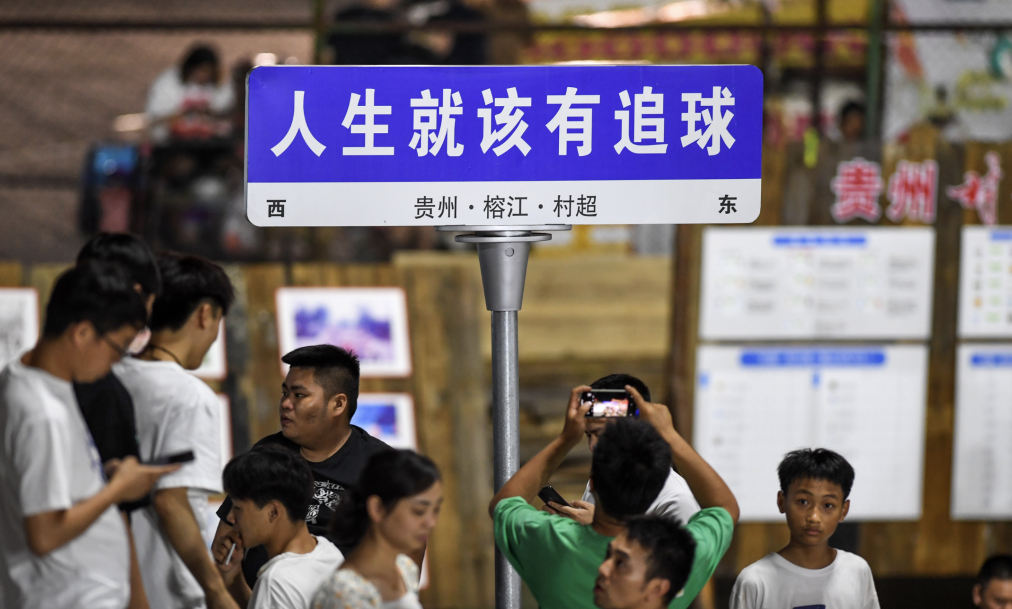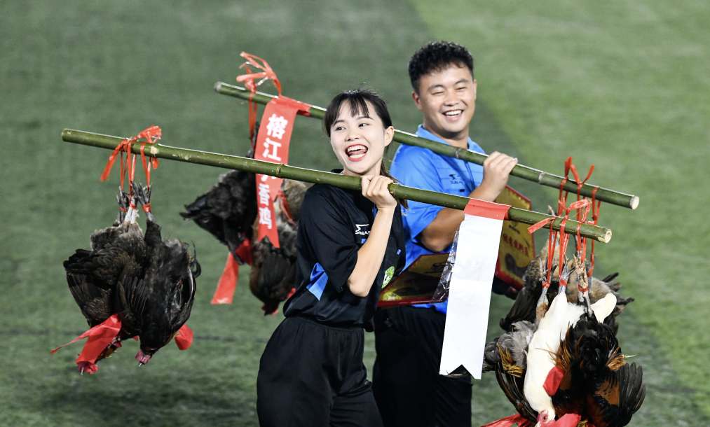 裁判员展示“村超”执裁奖品——榕江小香鸡