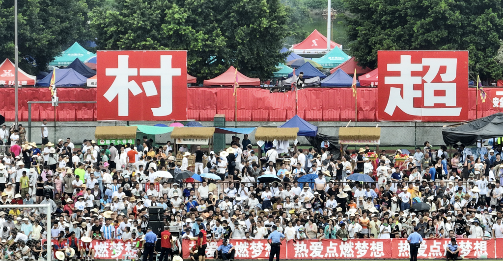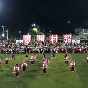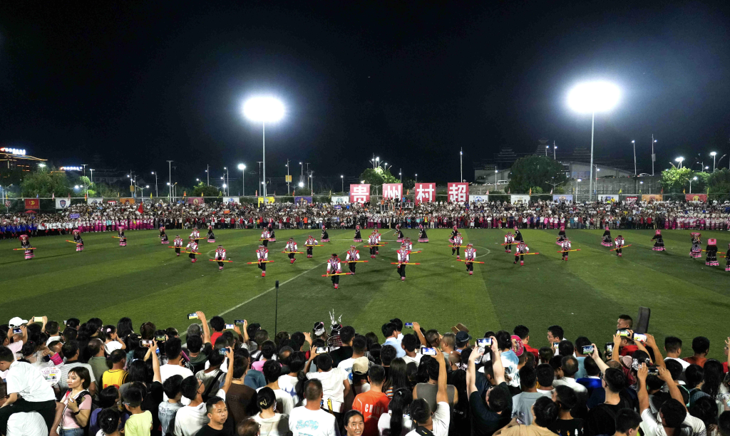 “村超”足球赛比赛现场,瑶族群众在表演舂杵舞