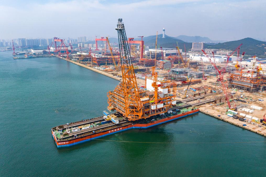 7月10日,渤中19-6凝析气田Ⅰ期项目中心平台在青岛成功装船,即将奔赴渤海西部海域,进入海上安装和联调阶段(无人机照片)。