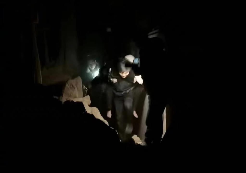 12月19日凌晨,大河家镇派出所辅警徐鹏和同事们从废墟中救出一名老人。(大河家镇派出所供图)
