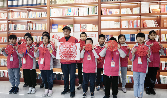 11月20日,“文明中国”主题采访报道组走进江苏省盐城市盐都区郭猛镇新时代文明实践所。盐城是一座英雄的城市,一片红色的热土,全市有248处红色遗址、128个以革命先烈的名字命名的镇村。郭猛镇就是以革命烈士、“独臂将军”郭猛得名而来。图为“江苏好人”、盐城市非遗传承人王柏林(前排左四)与他的小学徒们在展示剪纸作品。新华网 李雪芹 摄