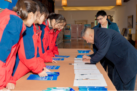 11月24日,“文明中国·看无锡”研讨会在无锡市举行。本次研讨会以“从无锡实践看共同富裕和城乡精神文明创建”为主题,旨在探讨交流共同富裕与城乡精神文明建设的实践经验和发展规律,进一步提升社会现代文明程度。图为研讨会前嘉宾在志愿者的引导下签名。新华网发(戴可建 摄)