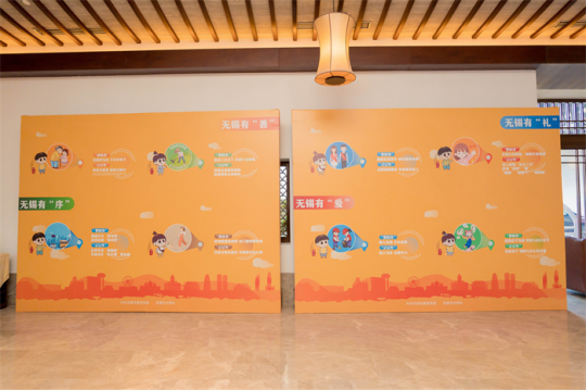 11月24日,“文明中国·看无锡”研讨会在无锡市举行。本次研讨会以“从无锡实践看共同富裕和城乡精神文明创建”为主题,旨在探讨交流共同富裕与城乡精神文明建设的实践经验和发展规律,进一步提升社会现代文明程度。图为会场外的“无锡有善、无锡有礼”主题展板。新华网发(戴可建 摄)
