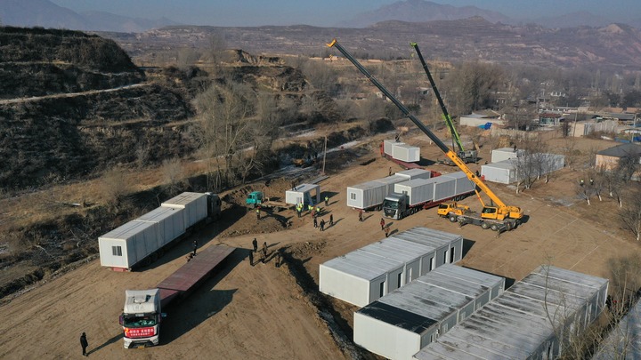在甘肃省积石山县柳沟乡阳山村的一处空地上,大型机械设备正在吊装活动板房。工作人员介绍,这种板房运来时已完成搭建,一间板房的安装时间压缩至半小时内,后续接入水电等就可入住。“我们正在加班加点,让受灾群众能尽快住进来。”