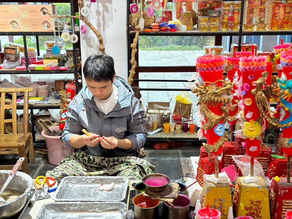 曹雳在工作室内制作龙凤花烛。新华社记者刘梓桐 摄