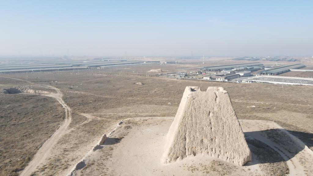 宁夏灵武市白土岗乡的白土岗烽火墩及远处的奶牛养殖基地。新华社记者许晋豫 摄