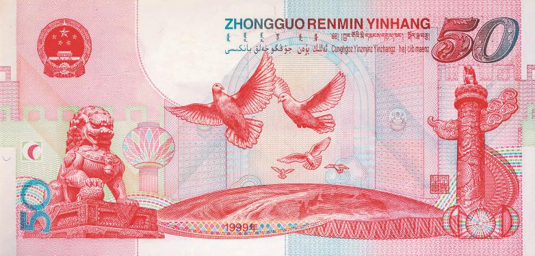 ↑1999年发行的庆祝中华人民共和国成立五十周年纪念钞背面图案,印有长城装饰图样。(中国印钞造币集团有限公司供图)