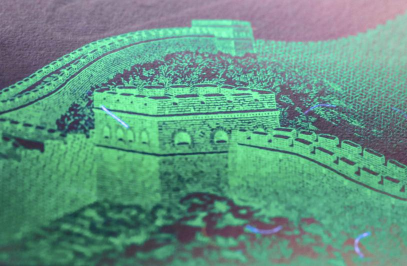 “通过‘长线短刻’的手法,我们让刻刀下的长城形成了‘线短势不断’的观感,而空间透视的手法,则给予人们充足的想象空间,仿佛在这一张纸币上就能看到长城绵延万里的景象。”花瑞松说。