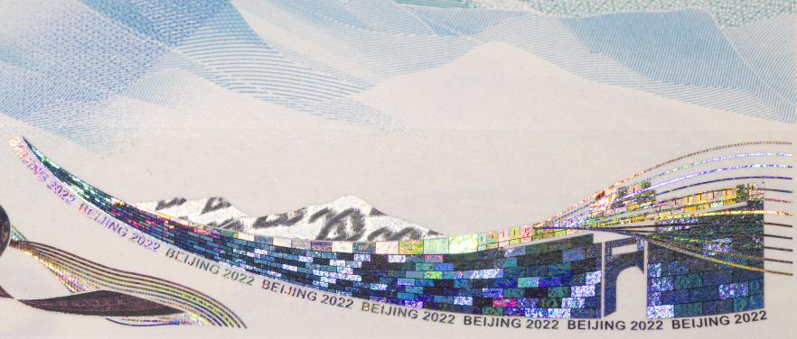 ↑2021年发行的第24届冬季奥林匹克运动会纪念钞——雪上运动项目,其将长城形象应用在动感全息、胶印、荧光等多种防伪图案中。(中国印钞造币集团有限公司供图)