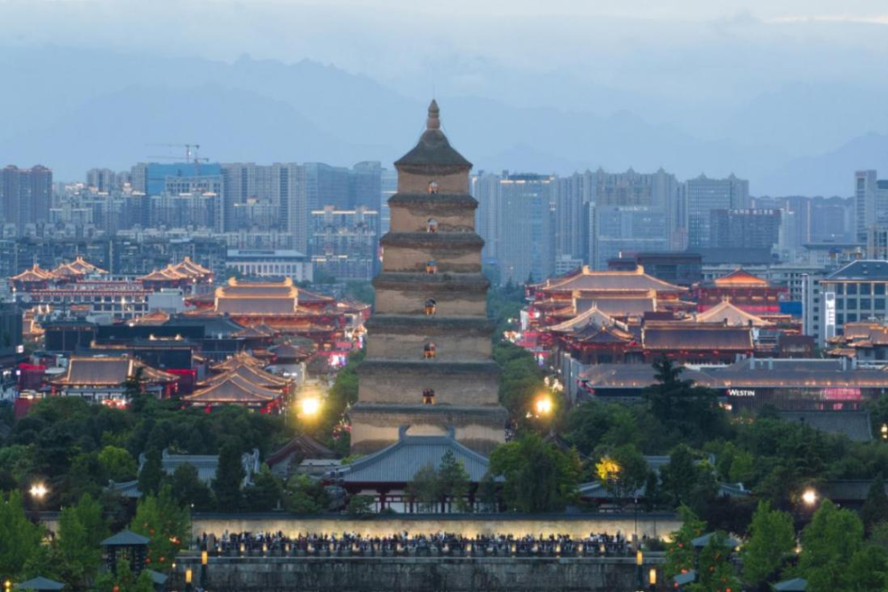 西安大雁塔及其身后的大唐不夜城街区。新华社记者 邵瑞 摄