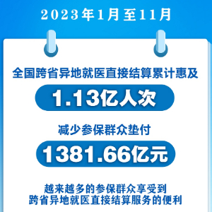 记者12月29日从国家医保局获悉,2023年1月至11月,全国跨省异地就医直接结算累计惠及1.13亿人次,减少参保群众垫付1381.66亿元。截至2023年11月底,全国联网定点医药机构达到52.31万家,较2022年底增长60.02%。