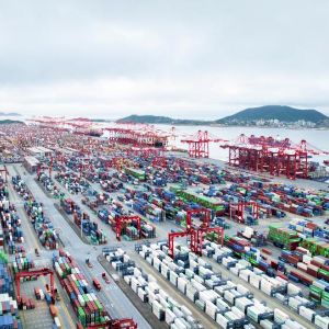 上海洋山深水港,远洋巨轮有序靠泊,五颜六色的集装箱被卸下货轮。