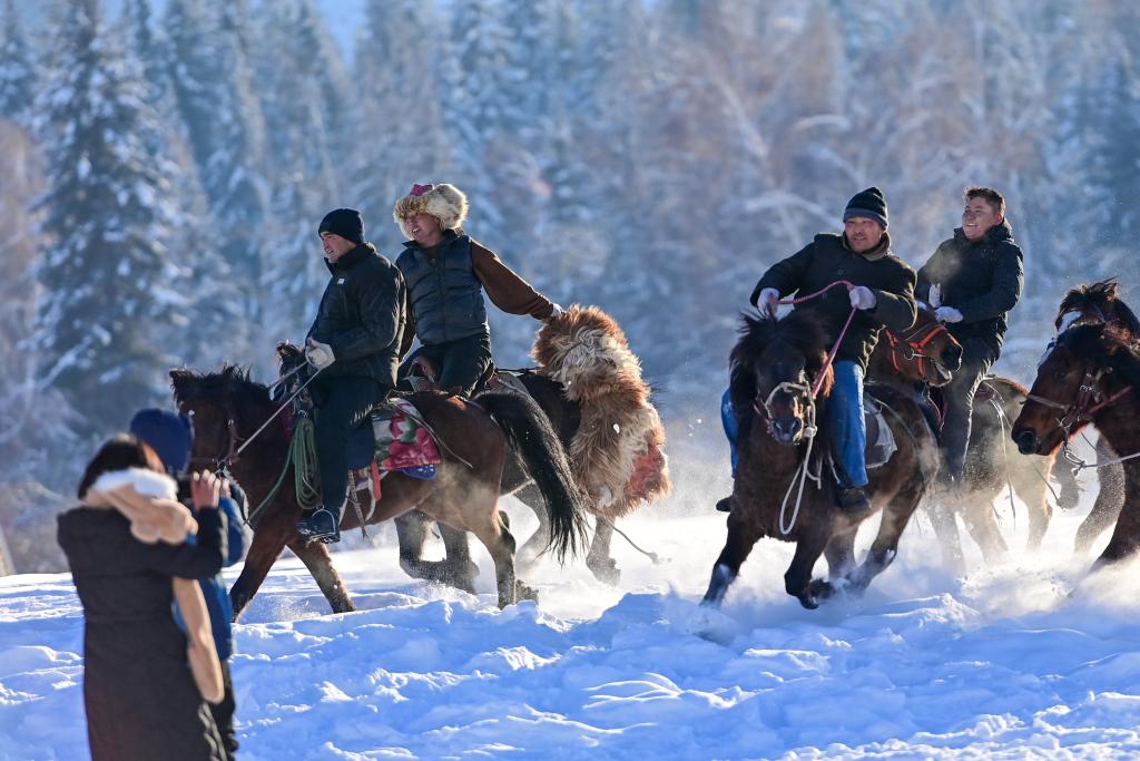 12月22日,在新疆阿勒泰地区富蕴县可可托海镇塔拉特村,村民为游客表演叼羊。新华社记者 丁磊 摄