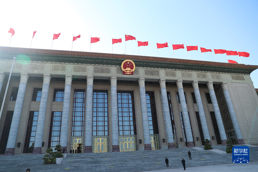 3月3日,全国政协十四届一次会议新闻发布会在北京举行,大会新闻发言人郭卫民向中外媒体介绍本次大会有关情况并回答记者提问。图为人民大会堂外景。新华网记者 焦鹏 摄