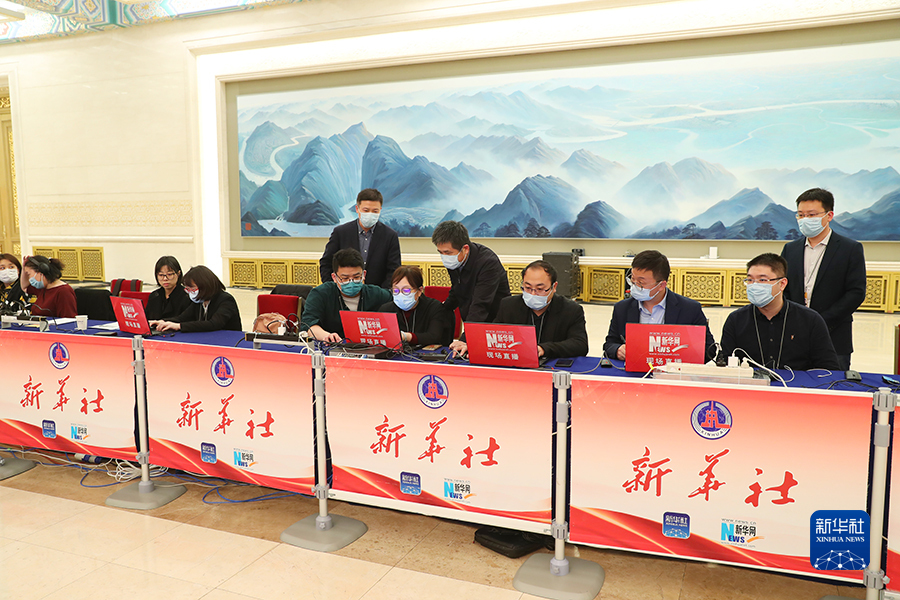 3月5日下午3时,全国政协十四届一次会议在人民大会堂三楼金色大厅举行民主党派中央和全国工商联领导人记者会,请各民主党派中央主席和全国工商联主席出席并回答记者提问。图为现场直播团队正在进行直播。新华网记者 焦鹏 摄