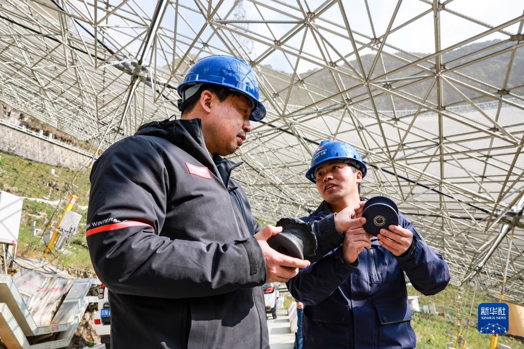 2月13日,姜鹏(左)在“中国天眼”的反射面板下与工作人员交谈(维护保养期间拍摄)。