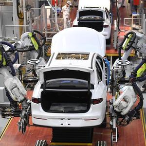 在广州市番禺区的广汽埃安新能源汽车股份有限公司总装生产线,机器人手臂在安装汽车轮胎(2023年2月24日摄)。新华社记者 邓华 摄
