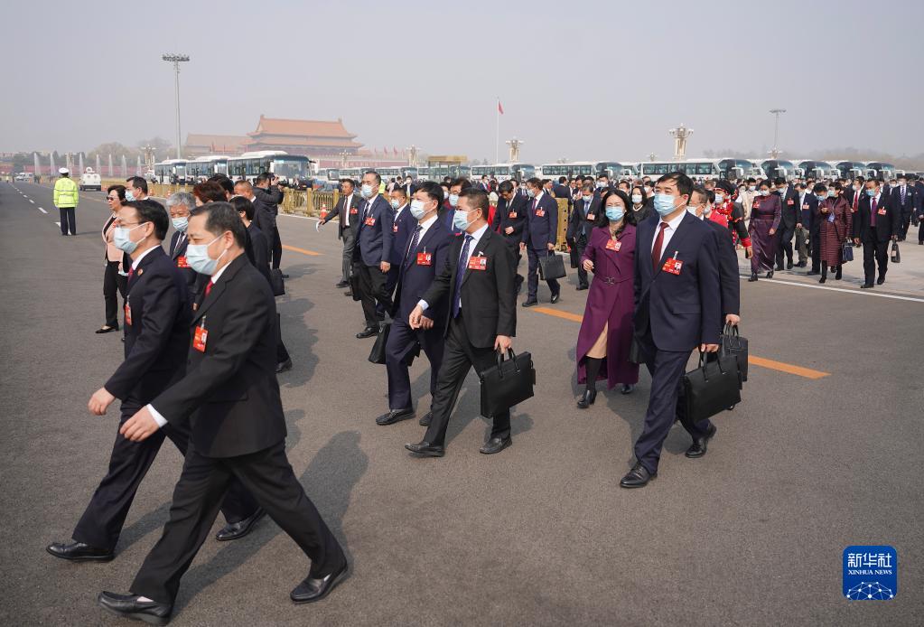 3月7日,十四届全国人大一次会议在北京人民大会堂举行第二次全体会议。这是全国人大代表走向会场。