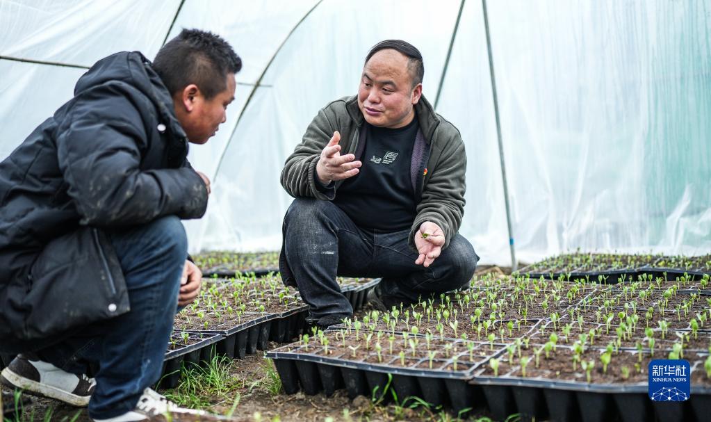 李世瑶(右)在六枝特区银壶街道东风村给种植户介绍西瓜育苗技术要点(2月25日摄)。