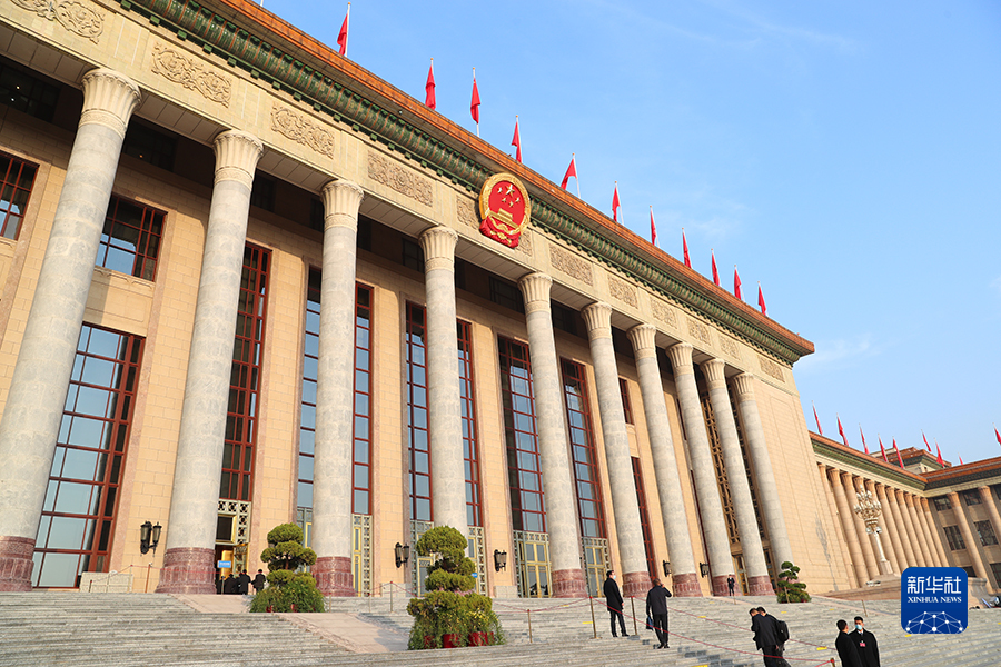 10日上午9时,十四届全国人大一次会议在人民大会堂举行第三次全体会议。图为人民大会堂外景。(新华网记者 焦鹏 摄)