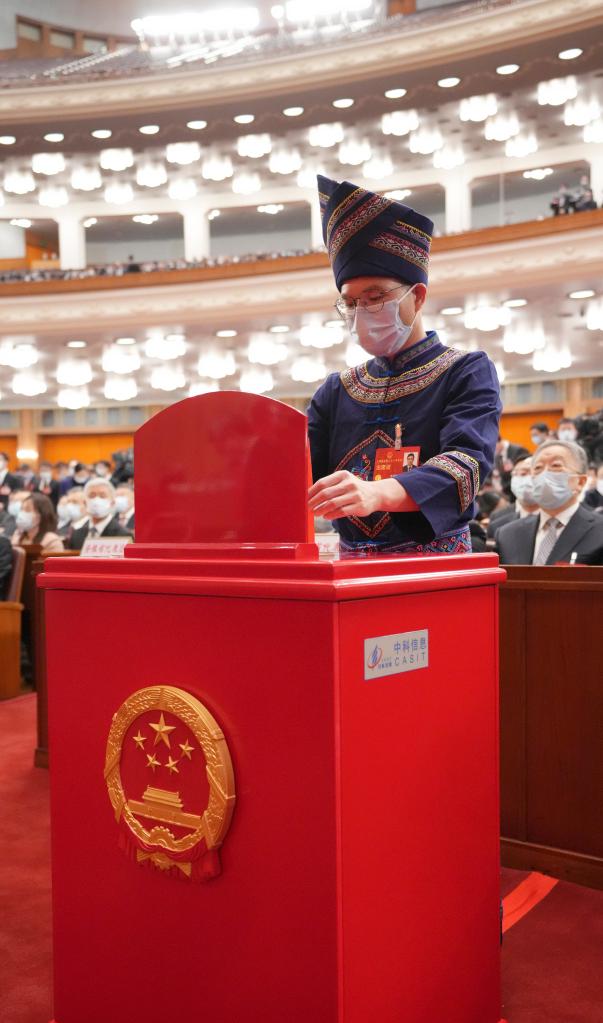 3月10日,十四届全国人大一次会议在北京人民大会堂举行第三次全体会议。这是代表在投票。