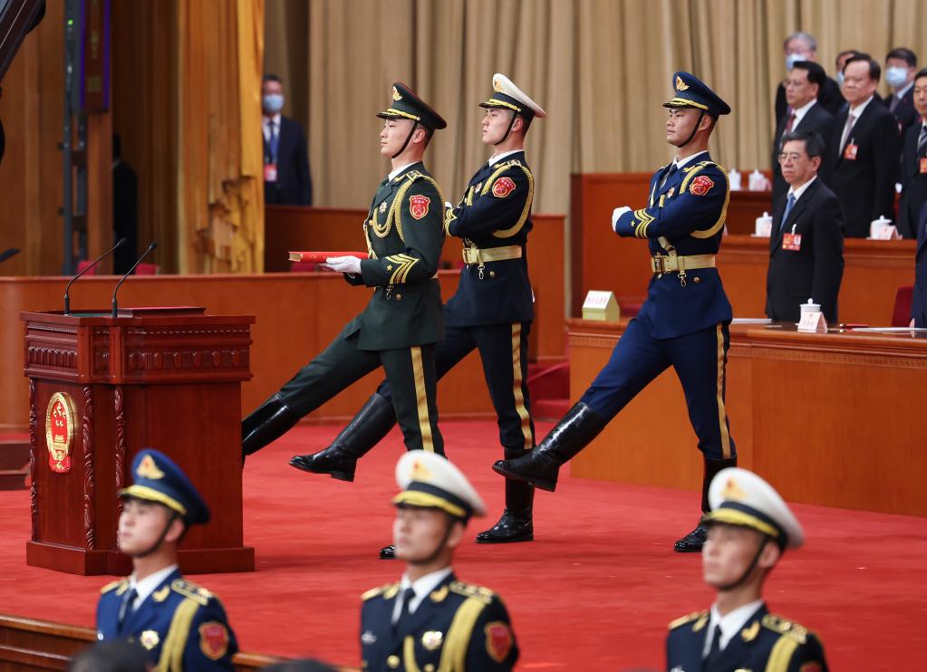 3月10日,十四届全国人大一次会议在北京人民大会堂举行第三次全体会议。全体会议各项议程进行完毕后,举行中华人民共和国第十四届全国人民代表大会第一次会议宪法宣誓仪式。这是礼兵护送《中华人民共和国宪法》入场。