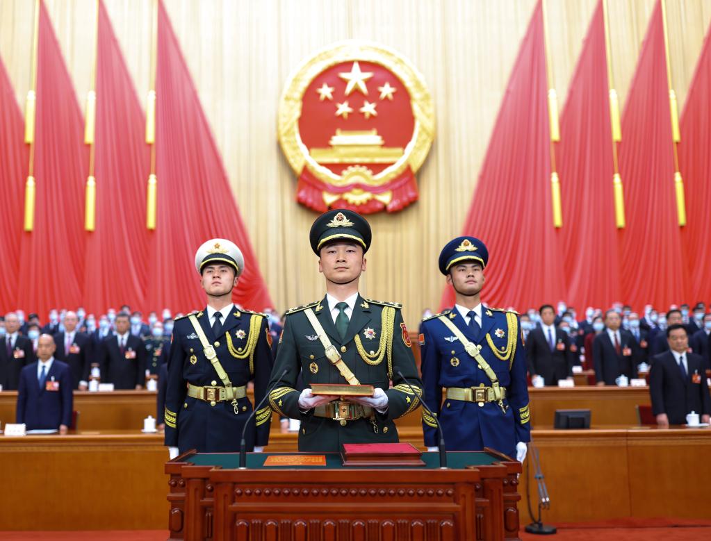 3月10日,十四届全国人大一次会议在北京人民大会堂举行第三次全体会议。全体会议各项议程进行完毕后,举行中华人民共和国第十四届全国人民代表大会第一次会议宪法宣誓仪式。这是礼兵护送《中华人民共和国宪法》入场,并将宪法放置于宣誓台上。