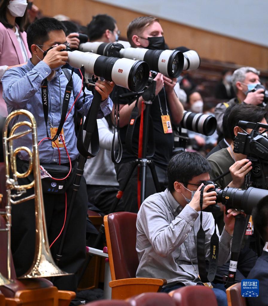 3月11日,十四届全国人大一次会议在北京人民大会堂举行第四次全体会议。这是记者在采访拍摄。