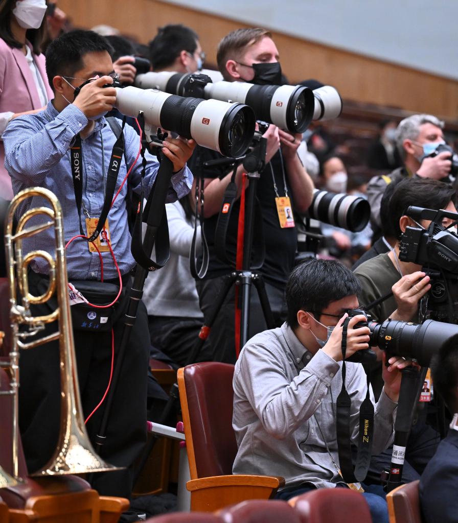 3月11日,十四届全国人大一次会议在北京人民大会堂举行第四次全体会议。这是记者在采访拍摄。