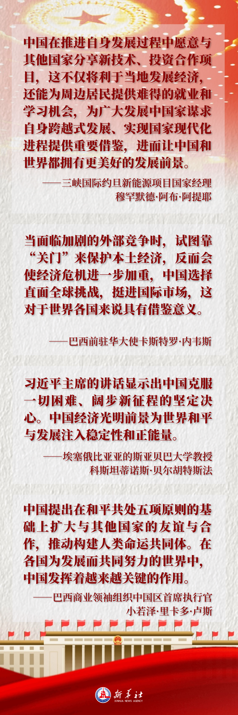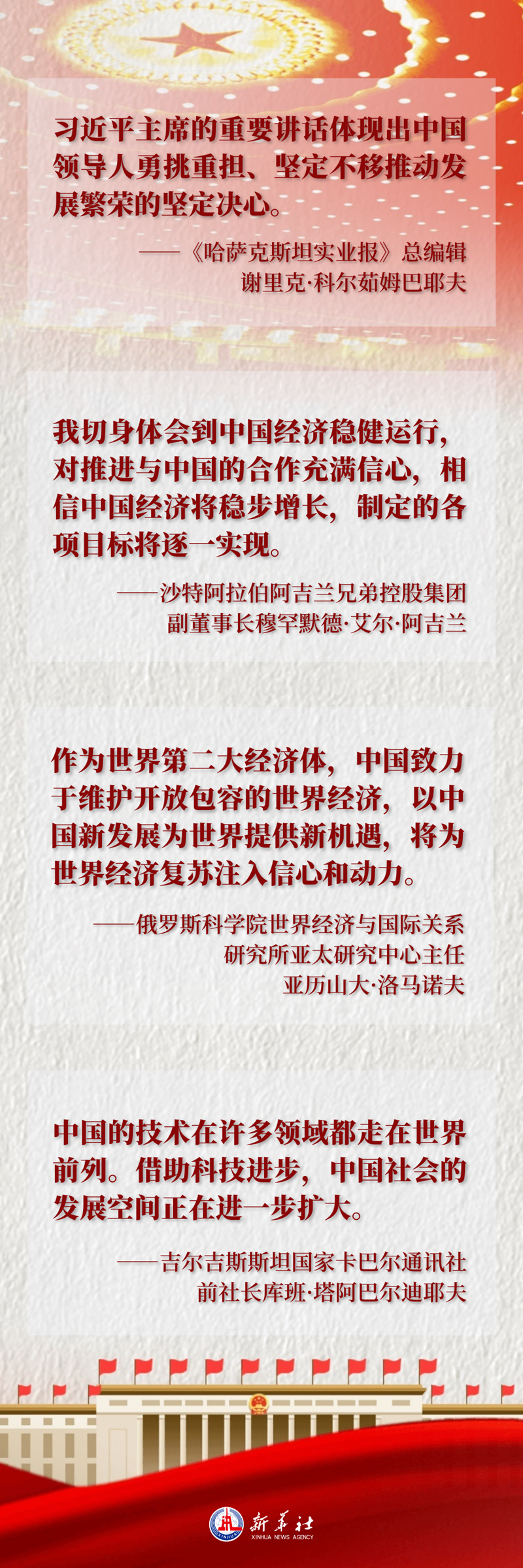 “习近平主席的讲话显示出中国克服一切困难、阔步新征程的坚定决心。中国经济光明前景为世界和平与发展注入稳定性和正能量。”贝尔胡特斯法说。