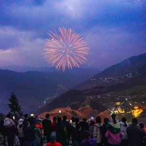2023年12月31日傍晚,在广西桂林市龙胜各族自治县龙脊镇平安村,游客在观赏梯田烟花美景。新华社发(潘志祥 摄)