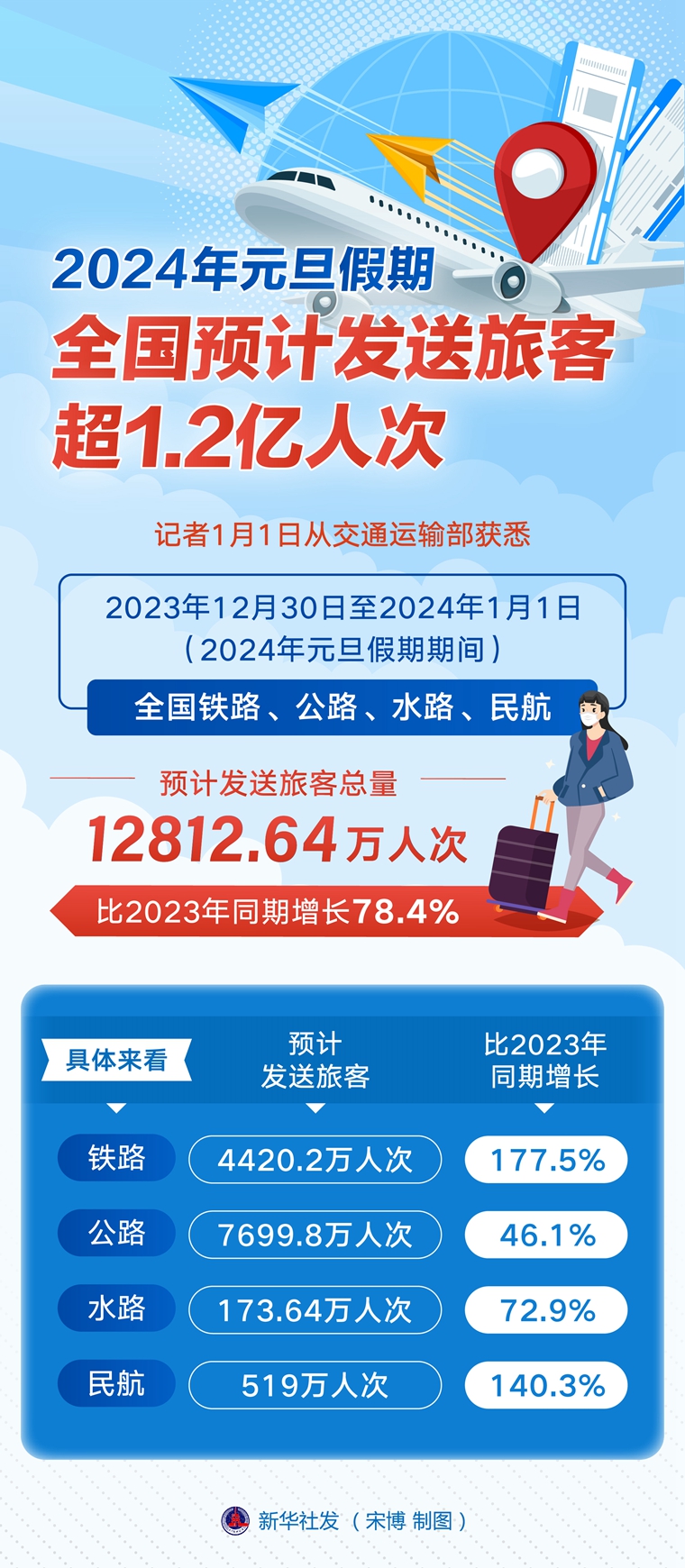 新华社北京1月1日电(记者叶昊鸣)记者1日从交通运输部获悉,2023年12月30日至2024年1月1日(2024年元旦假期期间),全国铁路、公路、水路、民航预计发送旅客总量12812.64万人次,比2023年同期增长78.4%。
