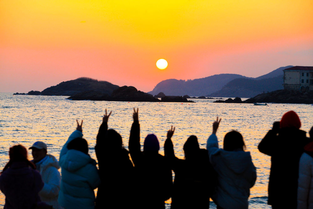在山东省威海市半月湾海水浴场,游客在海滩上观看日出(2023年1月1日摄)。新华社发(朱春晓摄)