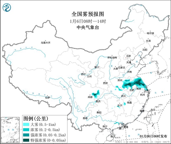 中央气象台今晨继续发布大雾黄色预警,今天早晨至上午,江苏、上海、安徽北部、河南东南部、四川盆地中部等地的部分地区有大雾,其中江苏中部、安徽中部、四川盆地中部等地的部分地区有能见度低于200米的强浓雾,局地有能见度不足50米的特强浓雾。