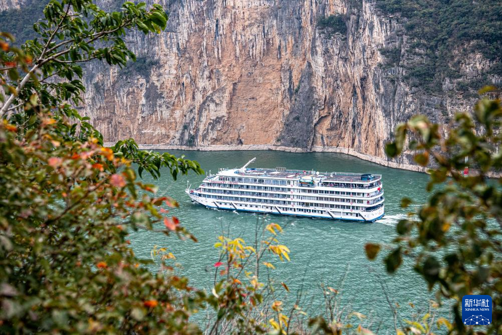 2023年11月29日,一艘游船从重庆市奉节县长江瞿塘峡夔门驶过。新华社记者 唐奕 摄