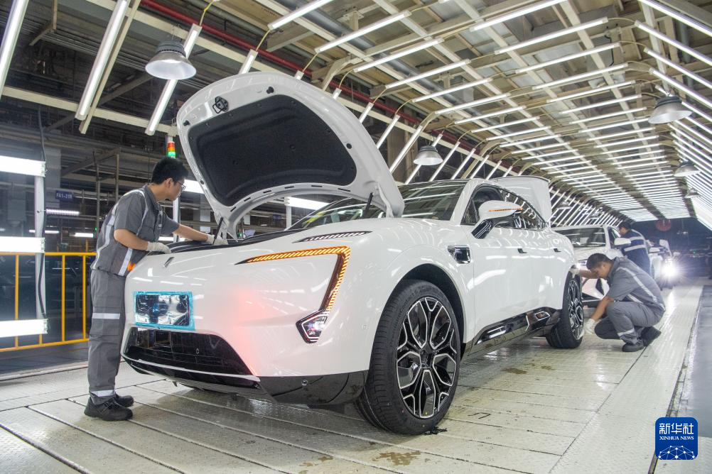 2023年7月20日,在位于重庆市江北区的长安汽车生产基地车间内,工作人员在新能源汽车阿维塔生产线上作业。新华社记者 唐奕 摄