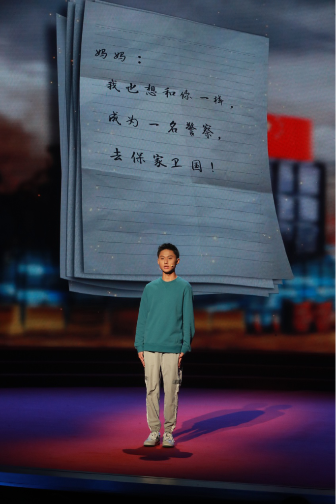 大屏上,一个孩子正在读妈妈写给他的信:“明天早上8点,我们就要离开祖国,唯一放心不下的是我的心肝宝贝云云。云云,我的宝贝儿子,记住了,你的妈妈是一名联合国维和警察……如果有人问你,你的妈妈是做什么的?你可以很自豪地告诉他,我妈妈是维和警察,表现一定优异。”