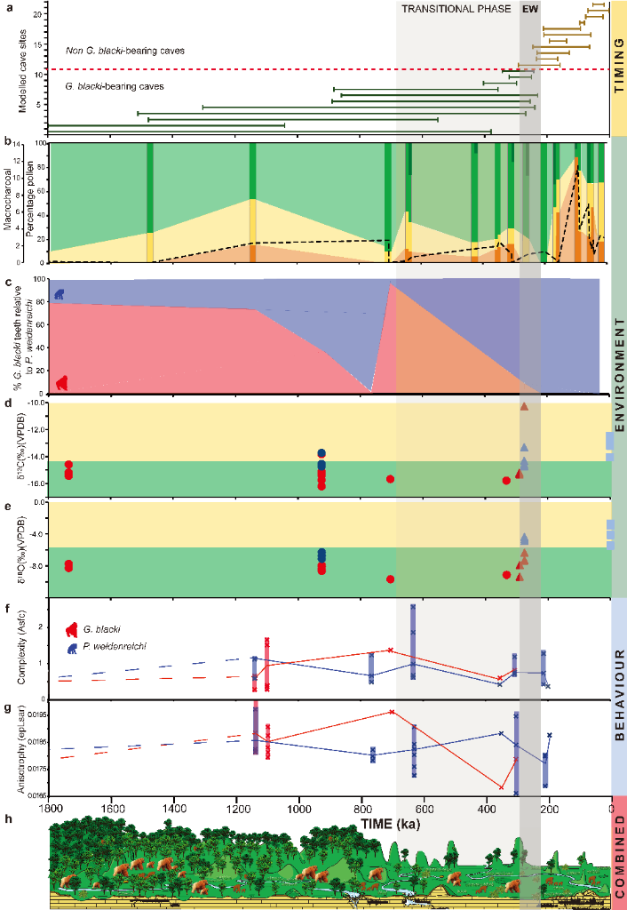 在此基础上,研究团队将6种独立的测年技术应用于含化石堆积物和化石本身,获得157个放射测量测年结果。这些年代数据与孢粉、哺乳动物群以及牙齿稳定同位素、微量元素、微磨痕等8个方面的分析结果相结合,全方位展现了步氏巨猿灭绝的前因后果——