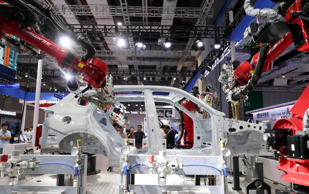 一组车身焊接机器人在第二十三届中国国际工业博览会上进行作业演示(2023年9月19日摄)。新华社记者 方喆 摄