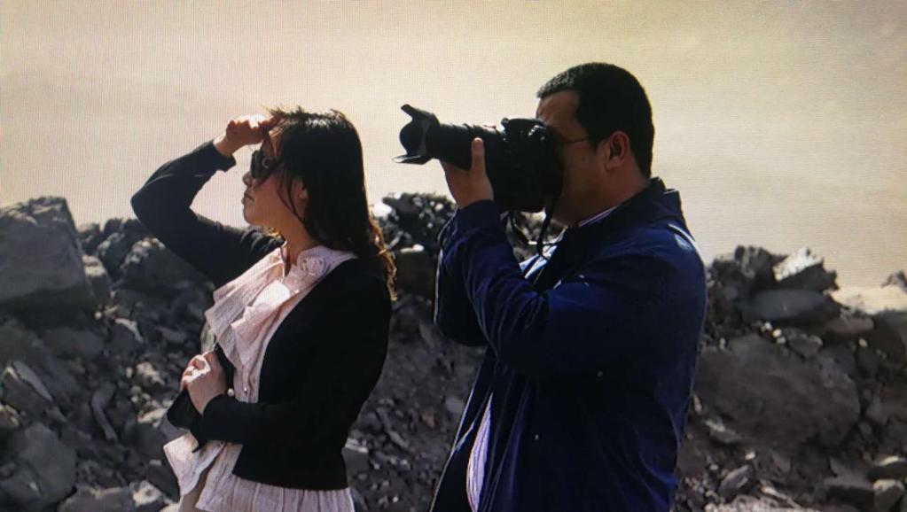魏彤欣(左一)深入海州露天煤矿矿坑中采访。阜新市传媒中心供图