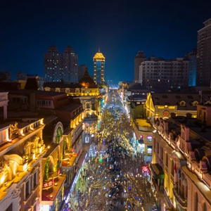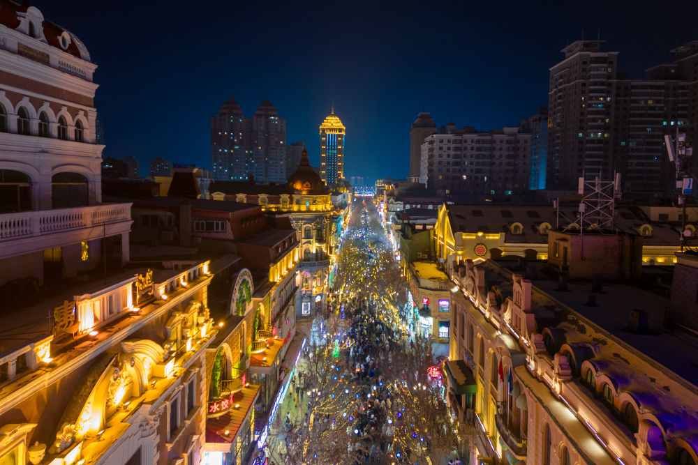 游客在哈尔滨百年老街中央大街上游玩(2024年1月9日摄,无人机照片)。新华社记者 张涛 摄