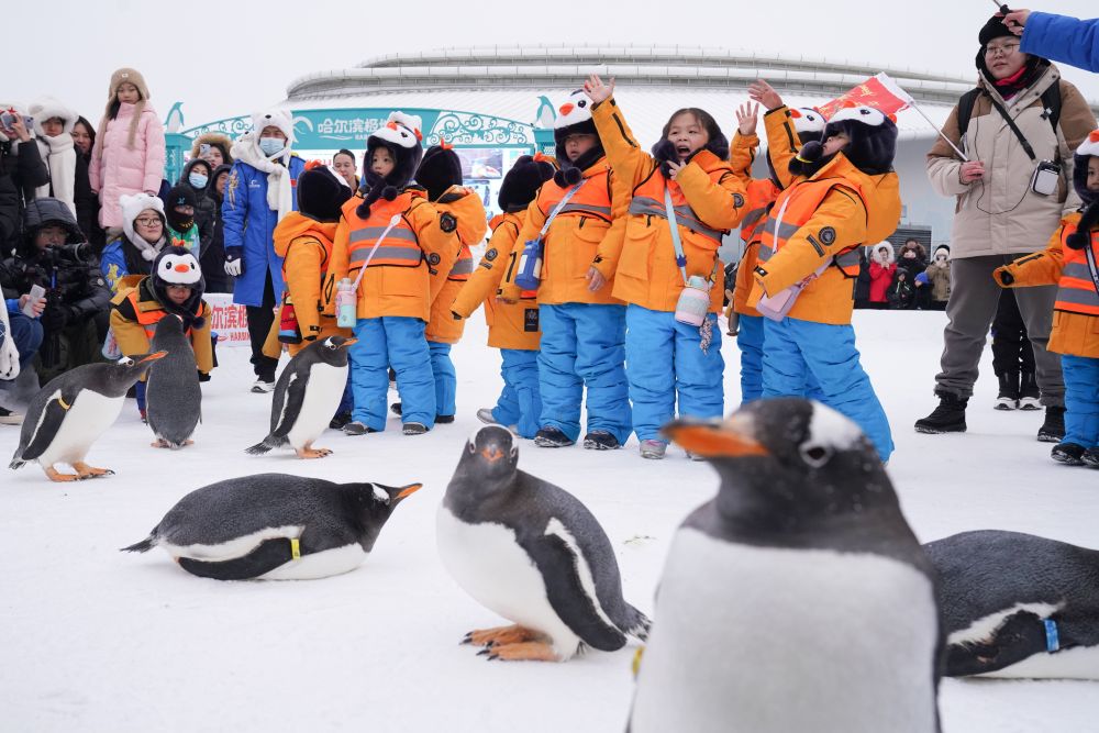在哈尔滨极地公园,来自广西南宁的“小砂糖橘”与企鹅互动(2024年1月6日摄)。新华社记者 王建威 摄