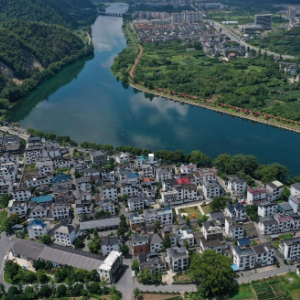 在浙江省衢州市开化县拍摄的钱塘江源头河——马金溪沿岸金星村。当地最大限度地保留流域滩地滩林,将“固堤+绿岸+慢道”结合建设,带动乡村旅游和民宿经济大力发展(2023年8月2日摄,无人机照片)。新华社记者 黄宗治 摄